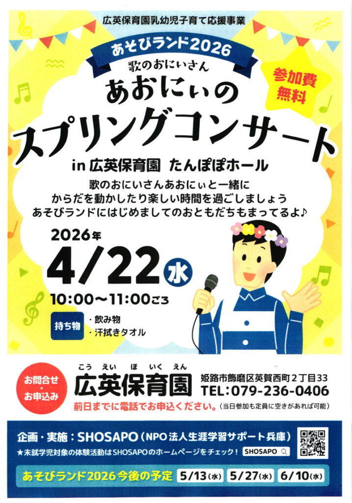 広英保育園 乳幼児子育て支援プログラム「あそびランド」のお知らせです。